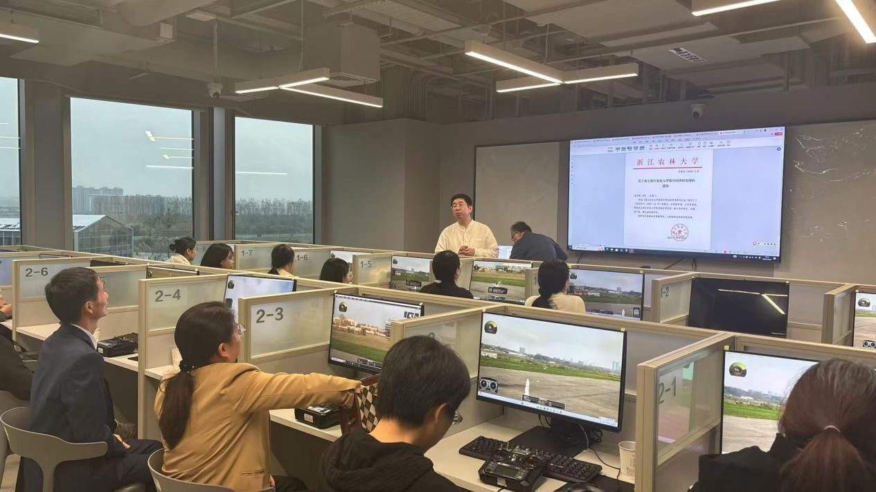 在低空经济研究所协同单位——浙江同创空间技术有限公司(以下简称“同创空间”)相关负责人的陪同下,全体教师俯瞰了占地超百亩的无人机飞行公园,亲身体验了无人机驾驶技能模拟实验室、参观了民用无人驾驶航空器操作员执照考试点、企业文化展示区及无人机执照培训学员照片墙。