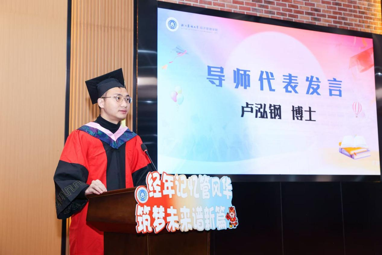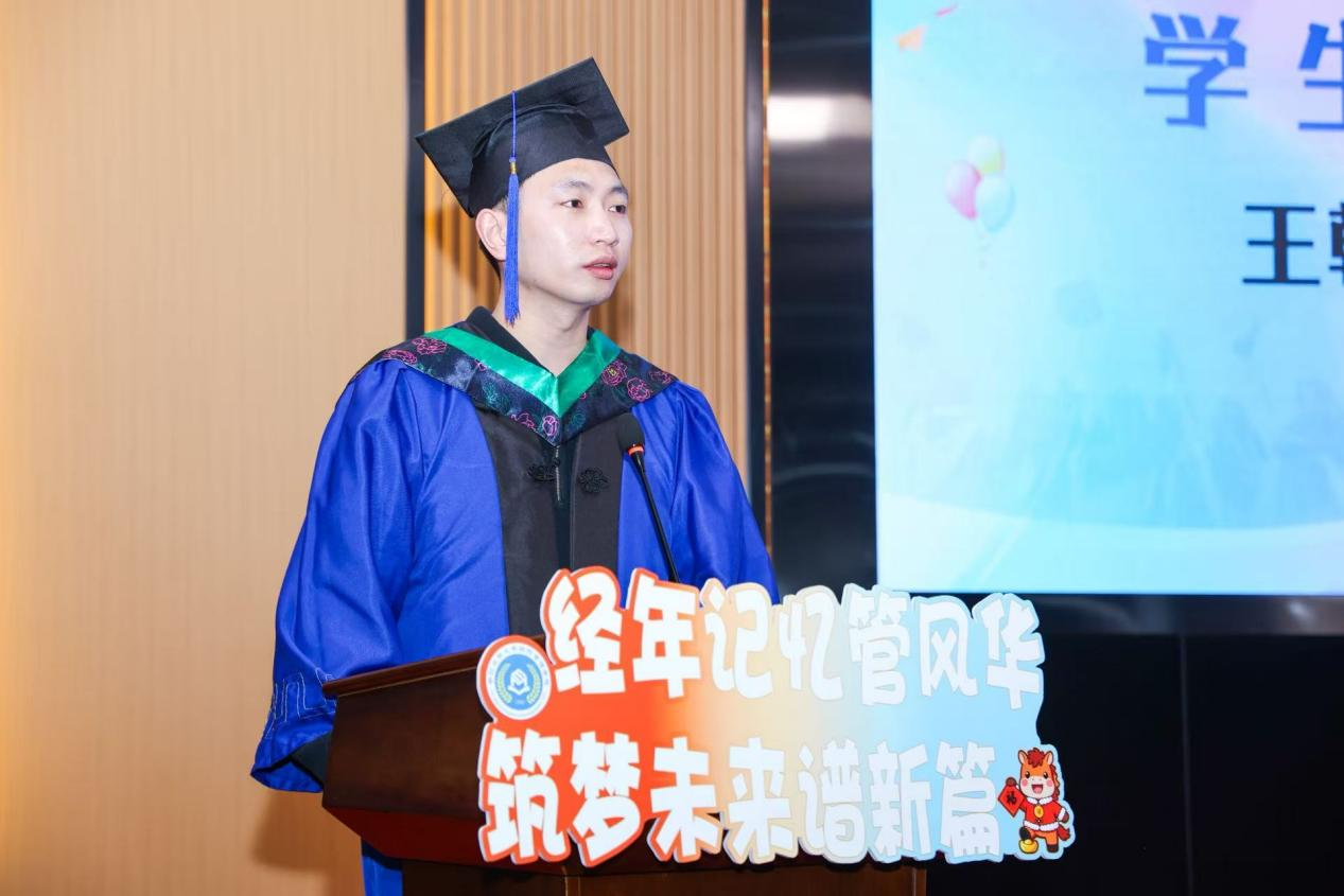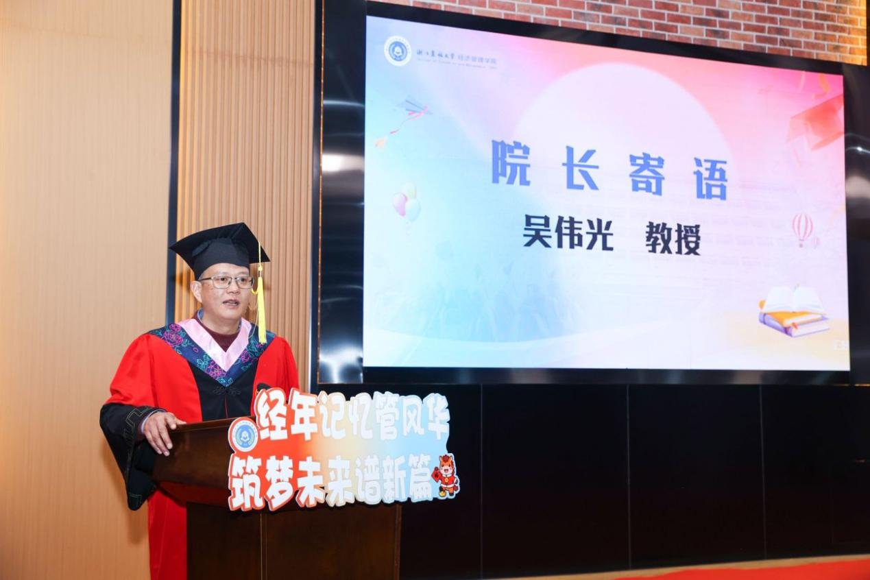 吴伟光院长为毕业生们送上寄语。他表示,经管学院一直是每一位同学坚强的后盾。他把“经年记忆,筑梦未来”这个主题词赠予毕业生们,并提炼三句话与大家共勉:一是,愿毕业生们如“种子”,扎根大地,生生不息;二是,愿毕业生们如“桥梁”,连接智能,引领未来;三是,愿毕业生们如“灯塔”,守正拓新,照亮前程。最后,他祝愿毕业生们在未来的道路上,无论是平坦还是崎岖,无论是顺利还是多艰,愿他们都能“脚踏实地、追求卓越”,勇敢地追逐梦想,积极地拥抱变革!