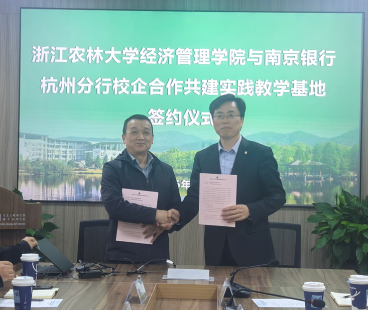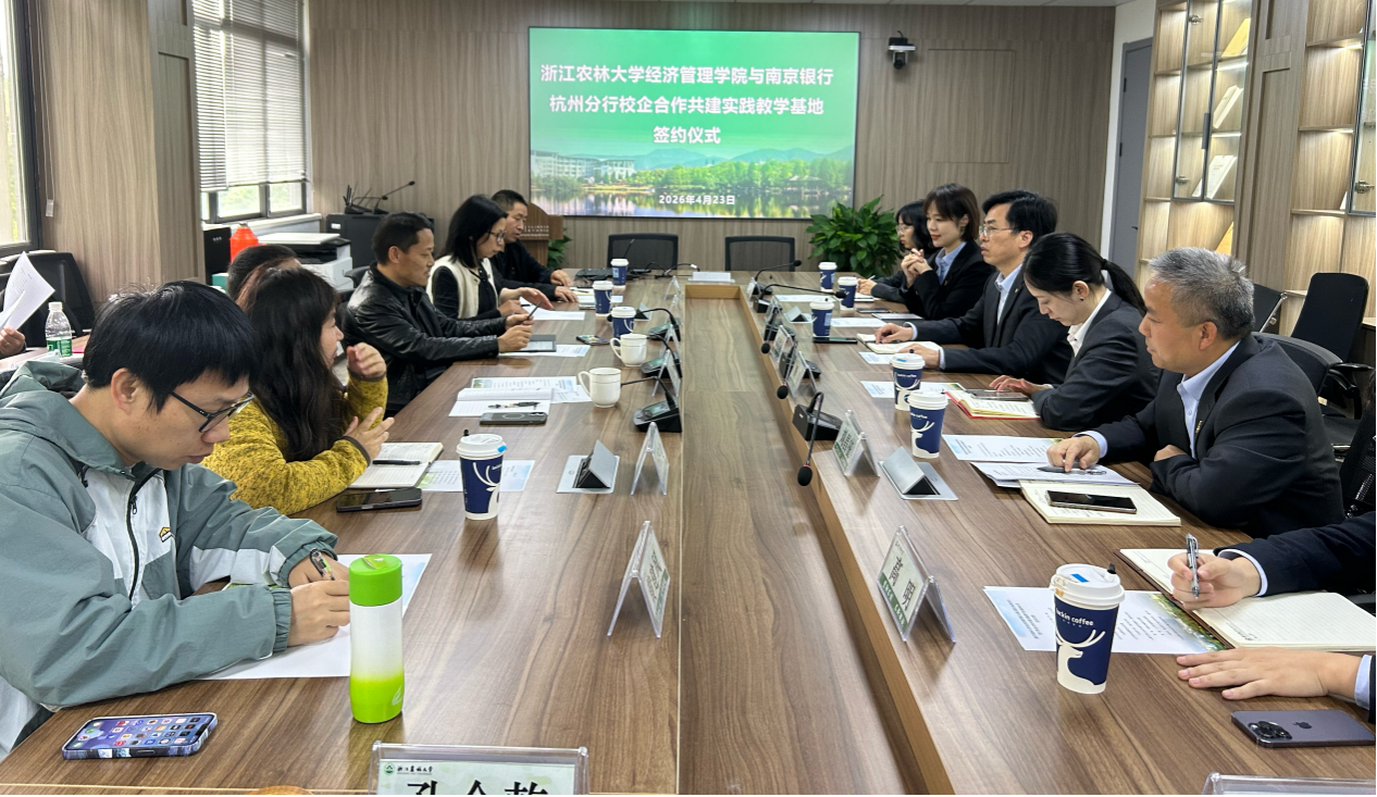 2026年4月23日下午,浙江农林大学经济管理学院与南京银行杭州分行举行支部党建联建暨校企合作共建实践教学基地签约仪式在衣锦校区实验大楼318会议室顺利举行。学院党委书记陈劲松、副院长蔡细平、应用经济学学科团队及学科骨干教师,南京银行杭州分行行长助理杨勇刚先生及相关部门负责人共同出席仪式。仪式由学院副院长蔡细平主持。