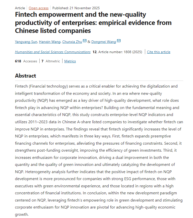 近日,我院应用经济学学科孙阳阳博士撰写的学术论文《Fintech empowerment and the new-quality productivity of enterprises: empirical evidence from Chinese listed companies》在《Humanities & Social Sciences Communications》上发表,孙阳阳博士为该论文第一作者,经管学院2023级金融工程专业本科生王涵钦同学为第二作者。《Humanities & Social Sciences Communications》是《Nature》旗下唯一专注于人文社会科学的子刊,致力于出版人文科学、行为科学和社会科学所有领域的高水平研究,被SSCI和A&HCI收录。在JCR社会科学分区为Q1,在中科院人文科学(小类)分区为一区。根据Web of Science JCI指数,该期刊在人文学科—多学科领域(Humanities,Multidisciplinary) 的408本期刊中排名第1,在社会科学跨学科领域(Social Sciences,Interdisciplinary)的271本期刊中排名第2,在全球人文社会科学领域具有重要影响力。