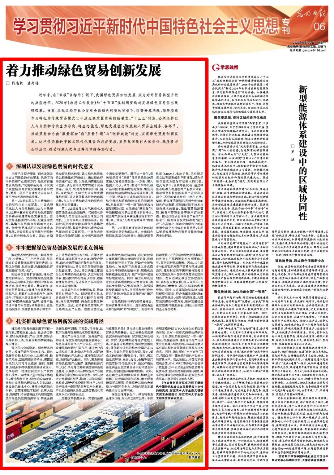 2026年4月13日,由钱志权教授和潘禹锡副教授合作撰写的《着力推动绿色贸易创新发展》理论文章在《光明日报》理论部主办的学习贯彻习近平新时代中国特色社会主义思想专刊发表。现将全文转载如下: